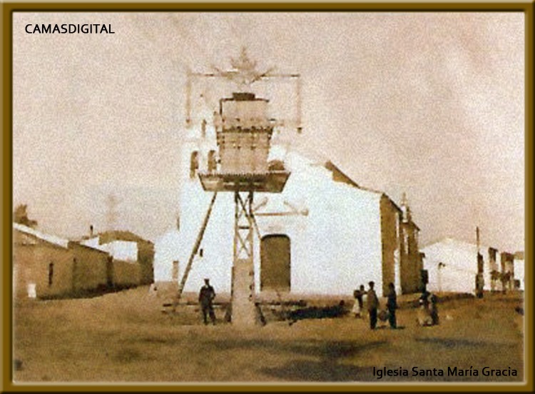 A finales del siglo XIX, Camas era un pequeño rincón anclado entre huertas, olivares y caminos polvorientos que llevaban a Sevilla. Las casas encaladas formaban un puzle humilde y sereno, donde los oficios tradicionales —arrieros, jornaleros, caleros, carboneros— marcaban el ritmo de los días. En el corazón de este paisaje reposaba la Iglesia de Santa María de Gracia, faro espiritual de un pueblo que aún vivía de cara al campo y de espaldas al bullicio de la capital.